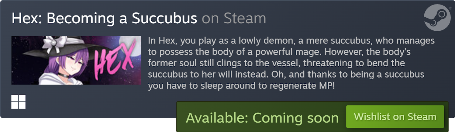 Hex: Becoming a Succubus is an erotic RPG for Windows and the web from the creator of Succubus Stories. The game is still in active development.